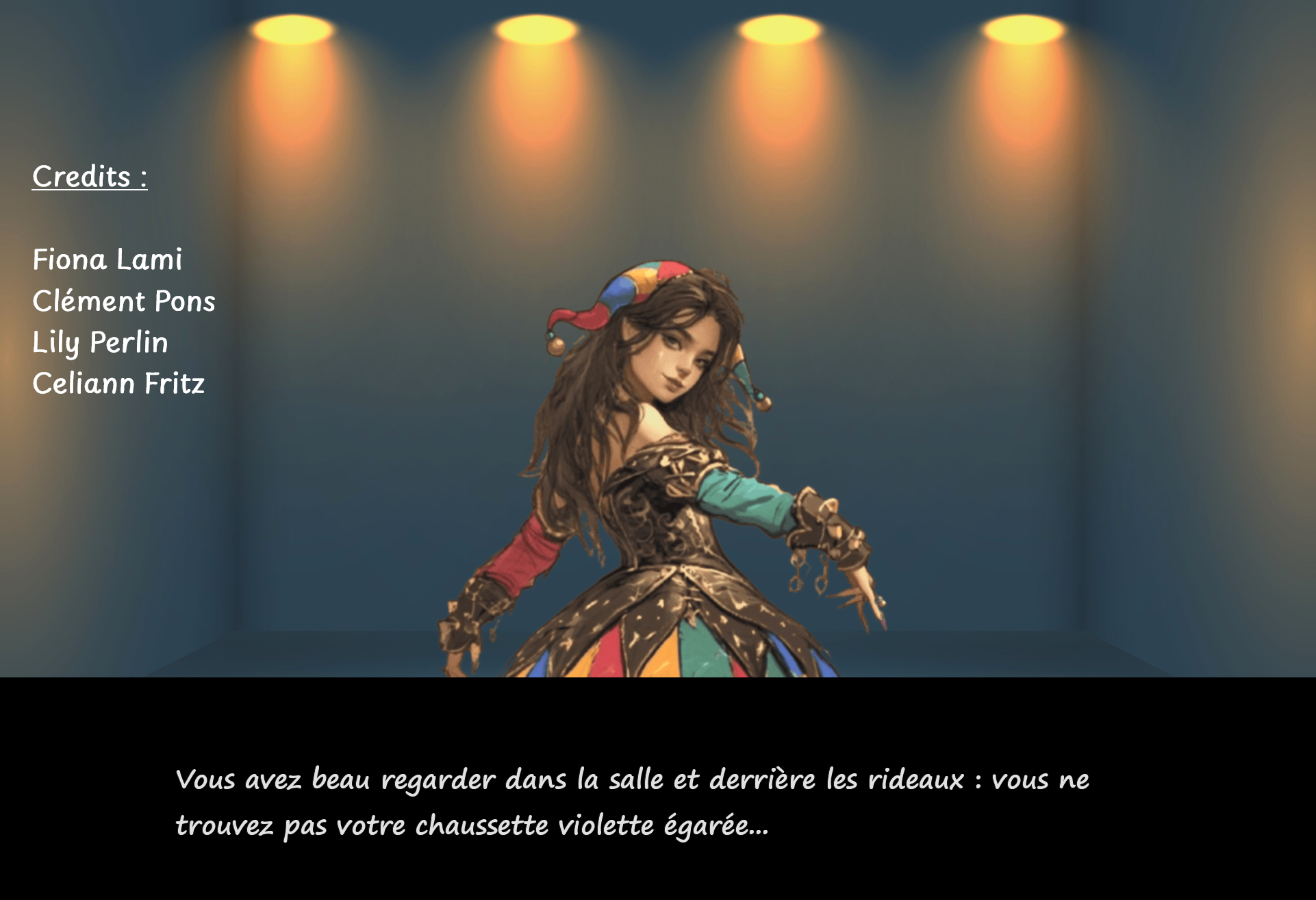 Vous jouez une arlequin qui a toujours rêvé d'être comédienne. Et aujourd'hui est votre jour de chance puisque vous passez le casting pour rejoindre la troupe d'un célèbre metteur en scène dont on se fiche du nom !